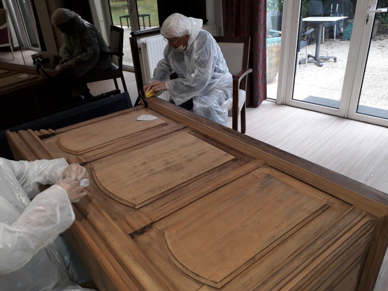 Les résidents ont entrepris de rénover le bar de la résidence. Décapage, ponçage et teinture. Le résultat sera comme toujours, des plus réussi!